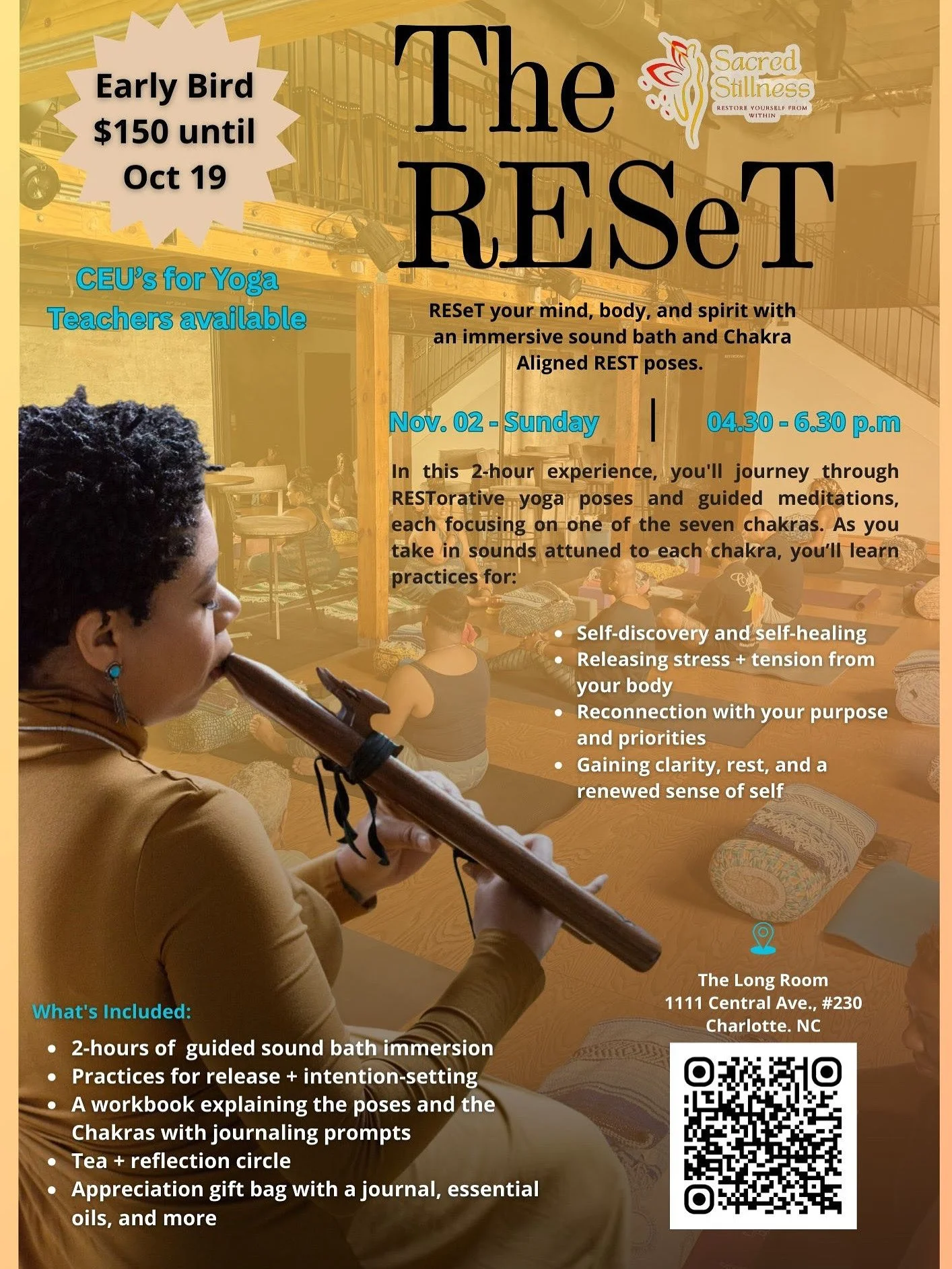 "The RESeT" Sunday, November 2, 2025 6:30 PM 6:30 PM The Long Room 1111 Central Avenue Charlotte, NC, 28204 United States (map) Google Calendar ICS RESeT your mind, body, and spirit with an immersive sound bath and chakra aligned REST poses. In this two-hou experience, you’ll journey through RESTorative yoga poses and guided meditations, each focusing on one of the seven chakras.